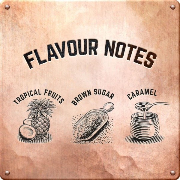 Con aromas de vainilla, miel y frutas tropicales, en boca regala manzana, caramelo, azúcar moreno y cereales, culminando en un final suave y persistente con recuerdo de butterscotch.