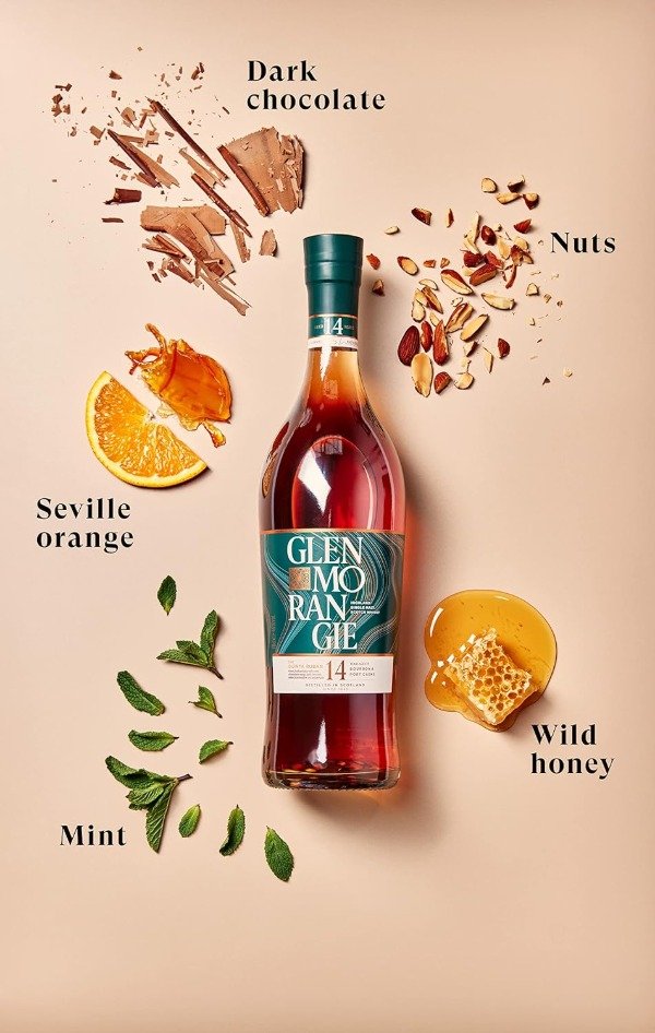 - Referencia de la línea de cask finishes: combina el destilado ligero y floral de Glenmorangie con la opulencia del vino de Oporto para un estilo rico y a la vez fresco.