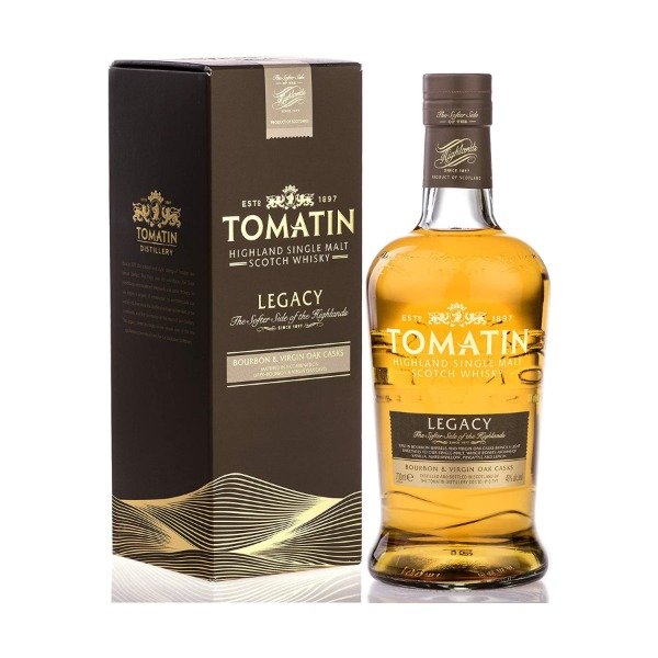 Highland amable y luminoso: Tomatin Legacy combina barricas ex‑bourbon y virgin oak para un single malt seco y accesible con vainilla, frutas frescas y un guiño especiado.